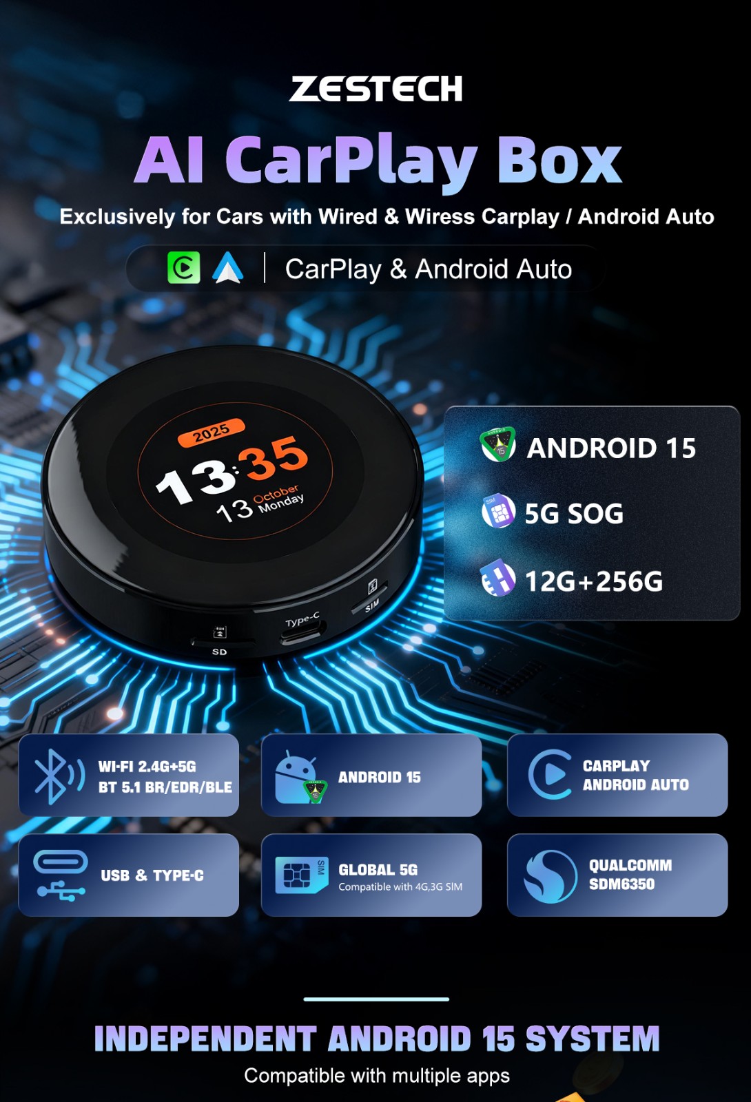 ZESTECH Wireless CarPlay Ai Box 12GB+256GB Android Auto Smart Box QCM 6350 Android 15 Plug and Play Wireless CarPlay Adapter